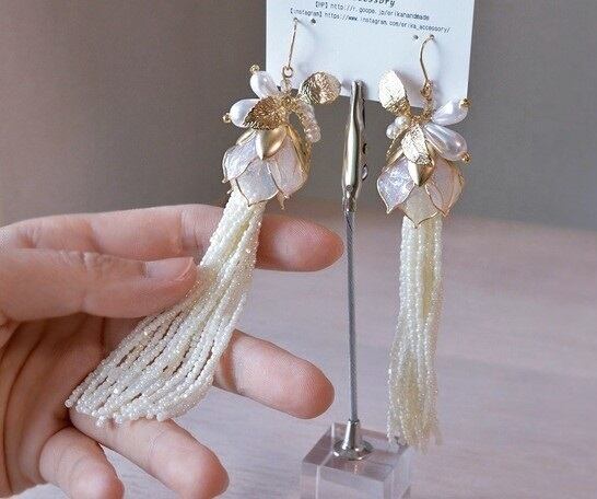 ウェディングアクセサリーとして定番のビーズタッセルを合わせました。